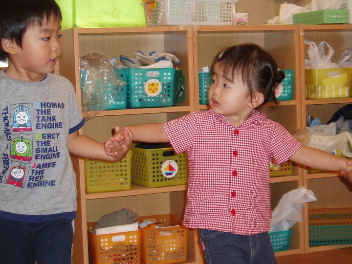 朝の挨拶、おやつタイム |